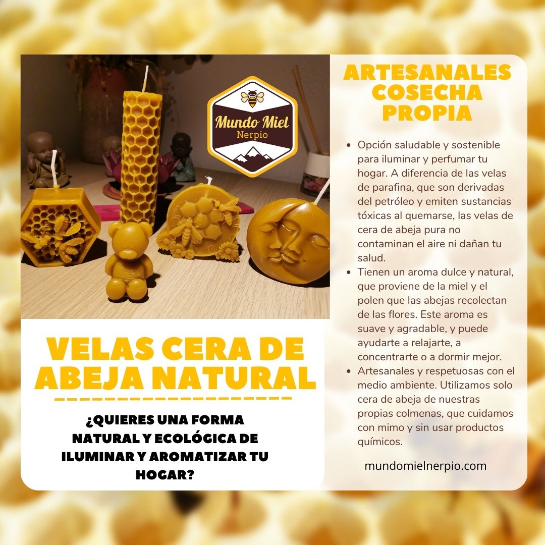Disfruta de la luz natural y el aroma suave de estas velas artesanales, elaboradas con cera de abeja pura de nuestra propia cosecha. Nuestras velas son biodegradables y libres de aditivos químicos. Además, la cera de abeja tiene propiedades purificadoras del aire, al emitir iones negativos que eliminan las partículas contaminantes.